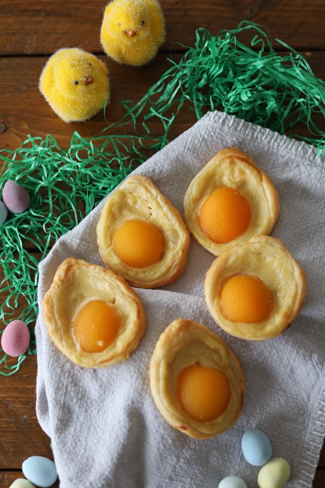 - Lege nun eine halbe Aprikose auf jedes Blätterteig-Ei und backe sie für ca. 15 Minuten auf der mittleren Schiene.