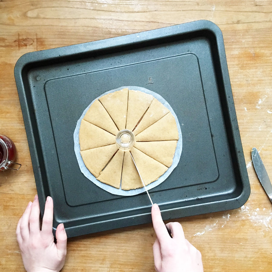Zur Orientierungshilfe ein Glas in der Mitte des Kreises positionieren und den Teig vom Rand des Glases zum äußeren Rand einschneiden. Danach das Glas entfernen.