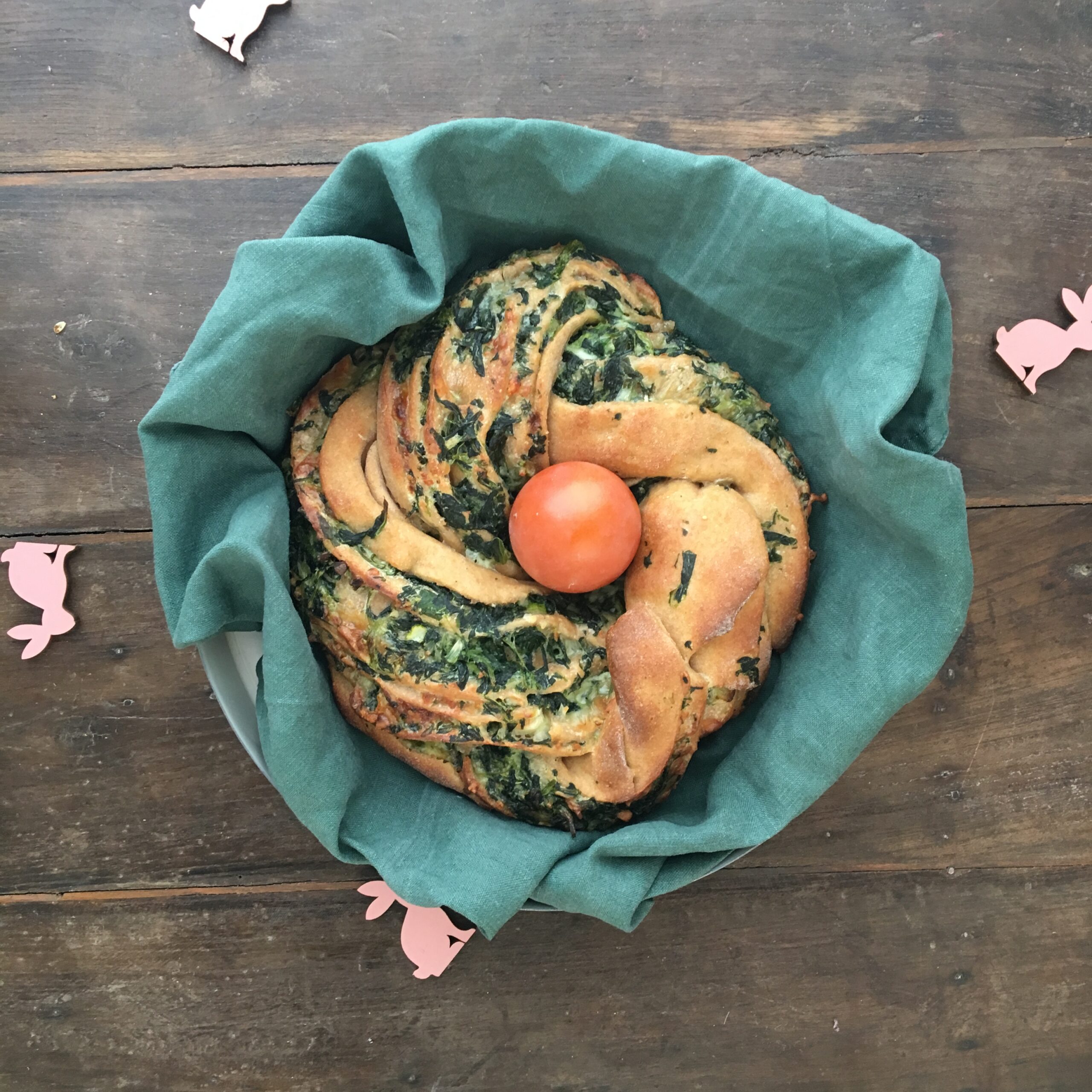- Den Kranz nun auf ein mit Backpapier belegtes Backblech geben und für gesamt ca. 25 min auf unterster Schiene backen. (bei Bedarf nach 15 Minuten z.b. mit Alufolie abdecken)